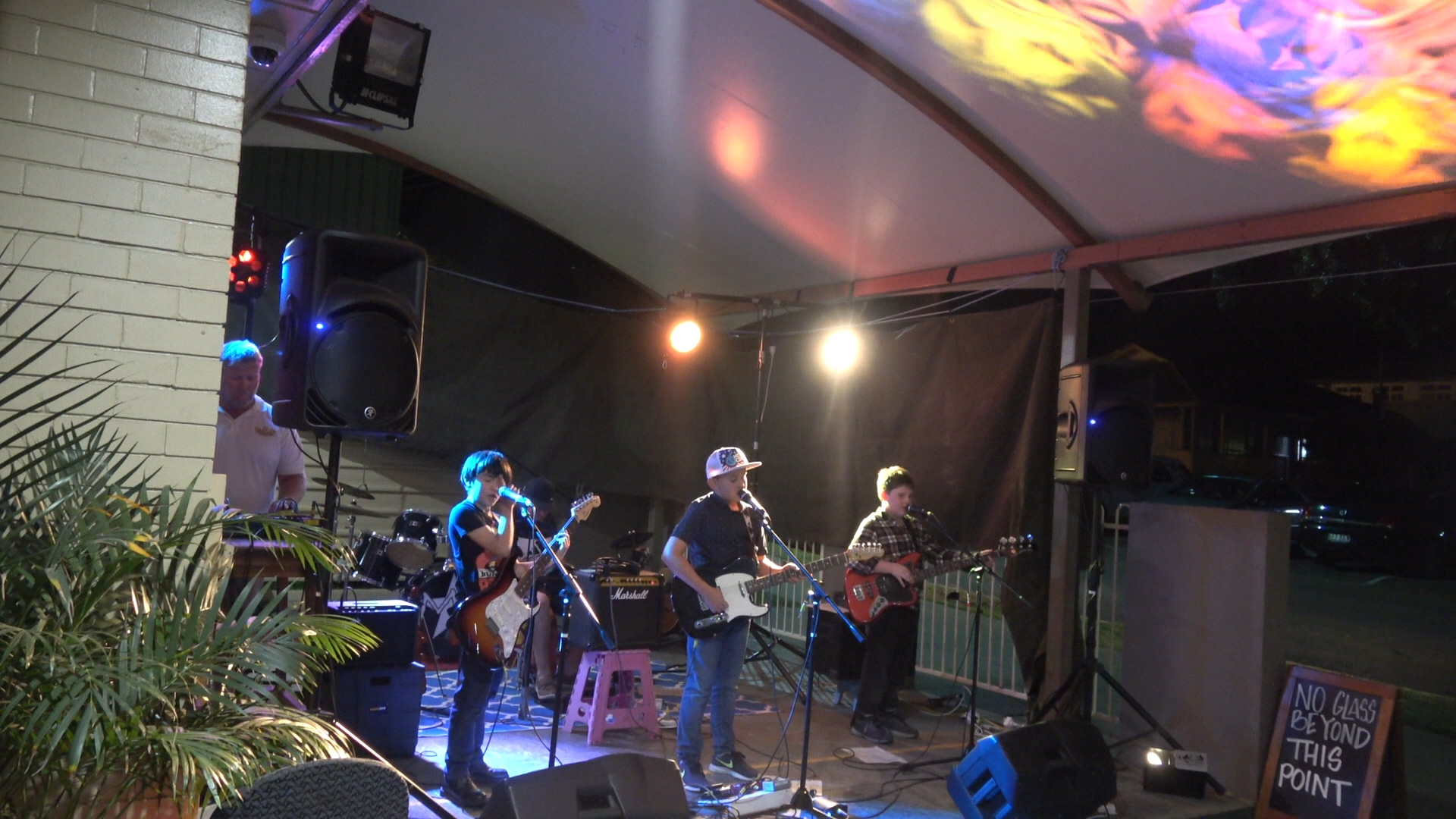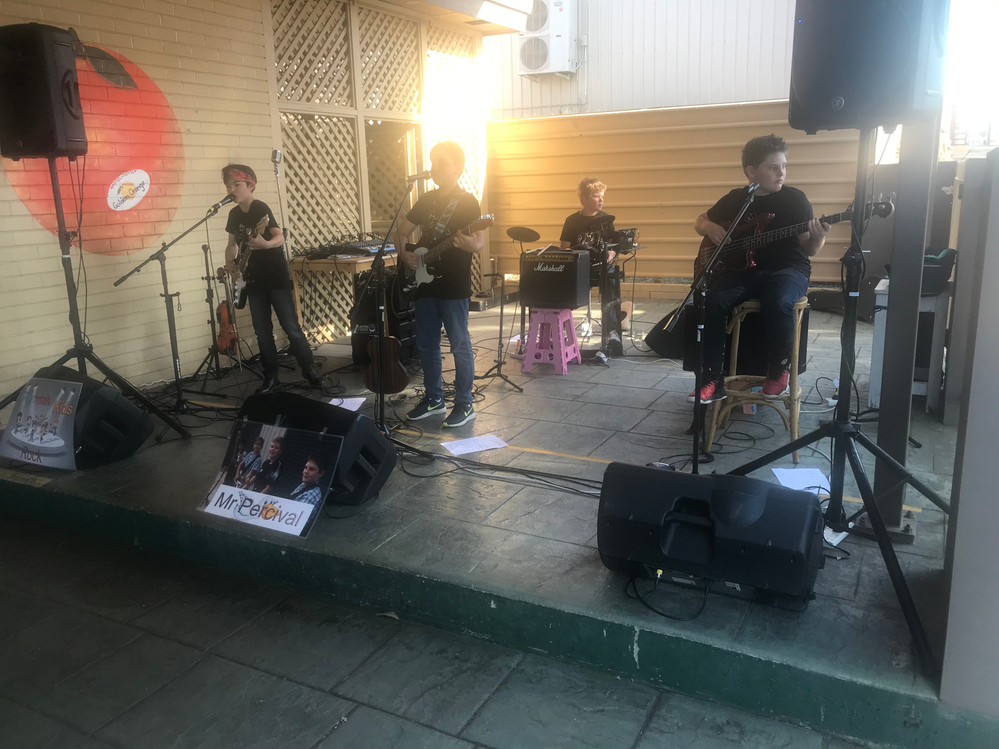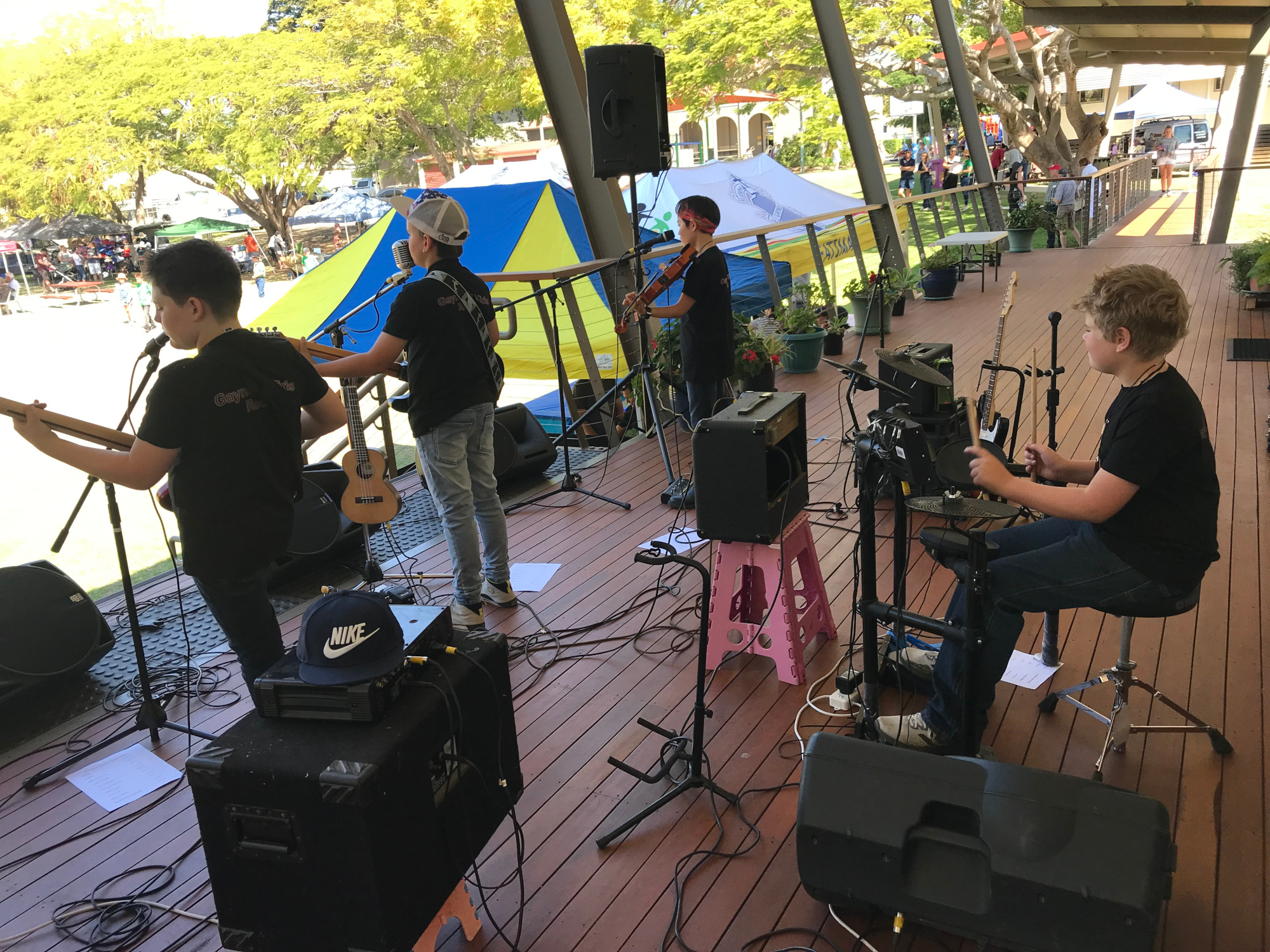 Because we were still living in our caravan at the time, rehearsals started in Michael Coulson’s shed. Handy for Noah because he just had to walk down the back yard. There was enough equipment in the form of electric guitars, amplifiers and PA system around the place to get things going with the aim of the boys playing on the main stage at the Gayndah Orange Festival later that year.