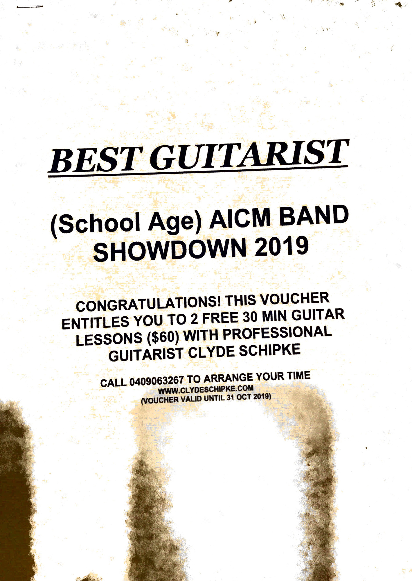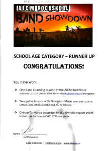 The next gig was in Gympie for the AICM ROCKSKOOL Band Showdown, School Age Category. It was held in the AICM venue in Gympie on the 11th of August, 2019. You can note from the photos that Nathan had a broken foot so had to sit down for the whole show. Donald did his thing with both guitar and fiddle and wasw clearly the winner of the best guitarist. The certificate show the boys as runners up was a little misleading. The judges rated them as the best band in the age group and it was clear that they were. However part of the first prize was a gig at the Gympie Muster coming up in a few weeks time. The judges from the Muster rated the school band from somewhere on the sunshine coast as having more stage appeal and so rated them first for the Muster gig. A shame for our boys but that is how it goes.