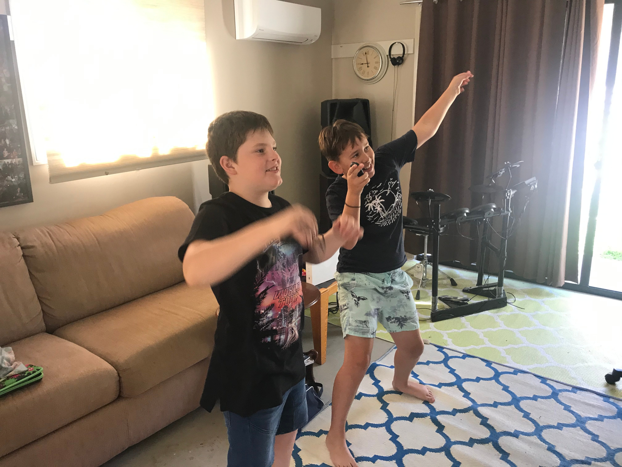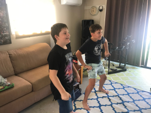 Being in a band like Mr Percival is not all hard work. Here are Nathan and Noah trying to keep up with Something ??? game. Was it on the Switch?